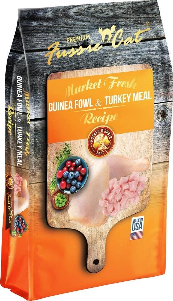 Fussie Cat Market Fresh Guinea Fowl & Turkey Meal Recipe Dry Cat Food is created with the freshest and finest ingredients for your feline family member. Cats are notoriously fussy when it comes to their food and require a diet based on animal proteins to truly thrive. That’s why Fussie Cat tailors the taste of each recipe based on actual feline feedback to ensure it’s equally delicious. This Physiologically Tuned and grain-free recipe features real chicken and turkey as the first ingredients to provide complete, high-quality protein and an excellent source of vitamin B12, riboflavin and phosphorus.