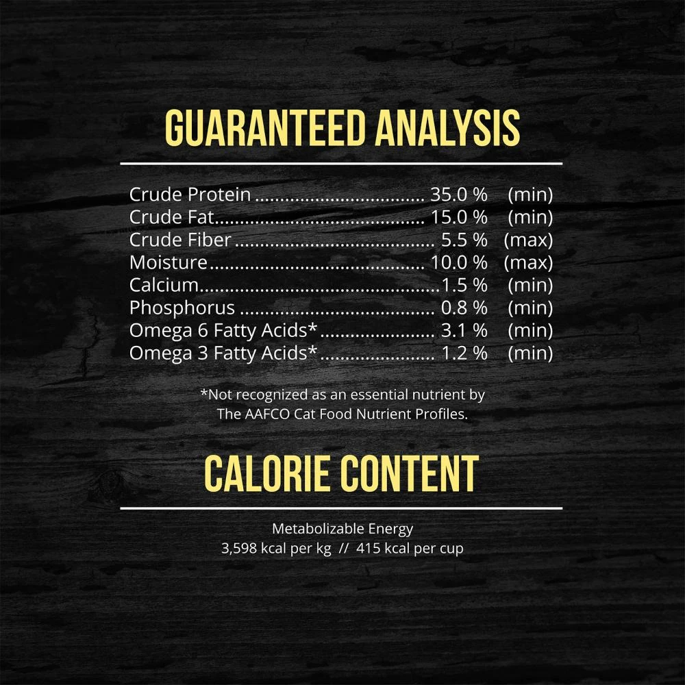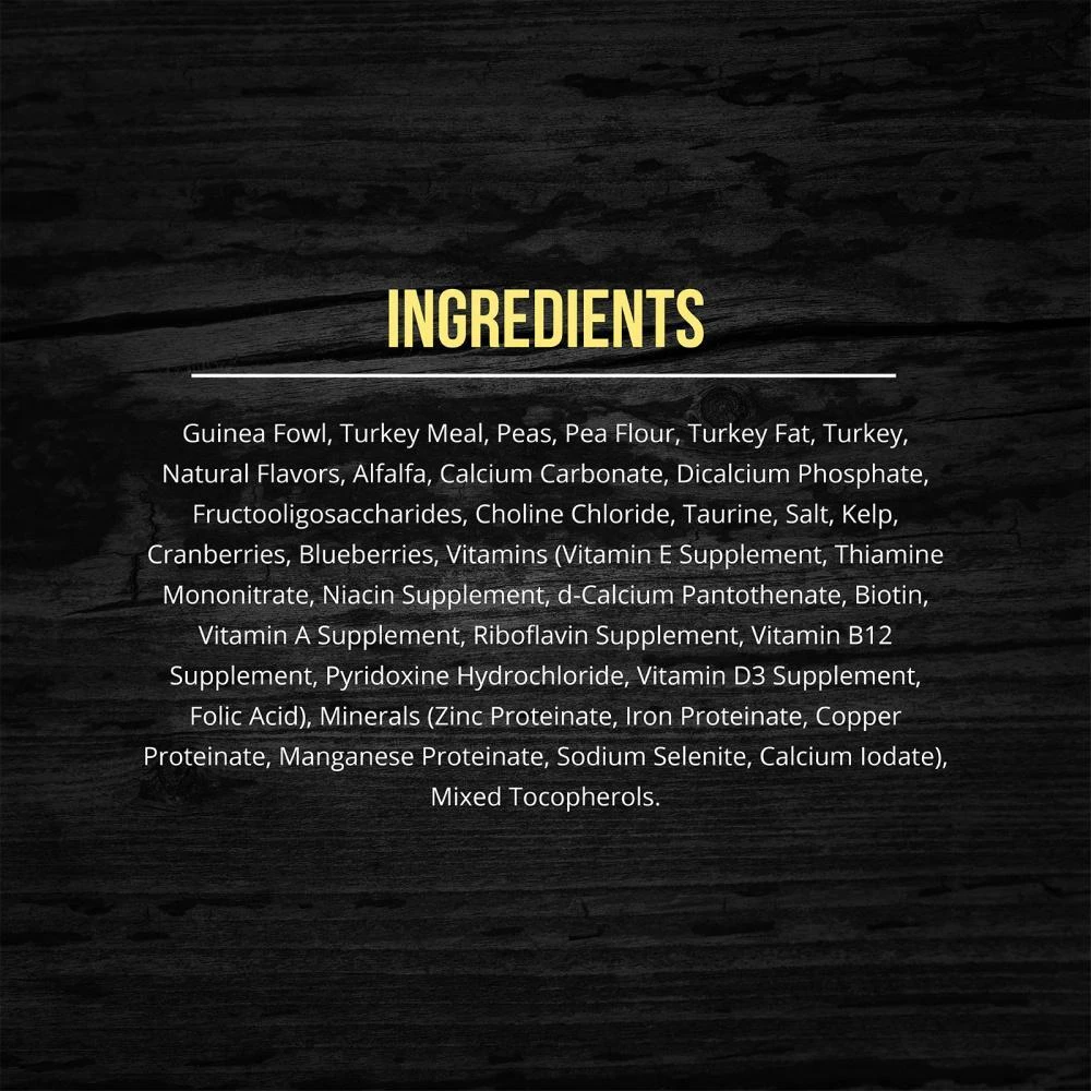 Guinea Fowl, Turkey Meal, Peas, Pea Flour, Turkey Fat, Turkey, Natural Flavors, Alfalfa Meal, Calcium Carbonate, Dicalcium Phosphate, Fructooligosaccharides, Choline Chloride, Taurine, Salt, Kelp, Cranberries, Blueberries, Vitamins (Vitamin E Supplement, Thiamine Mononitrate, Niacin Supplement, D-Calcium Pantothenate, Biotin, Vitamin A Supplement, Riboflavin Supplement, Vitamin B12 Supplement, Pyridoxine Hydrochloride, Vitamin D3 Supplement, Folic Acid), Minerals (Zinc Proteinate, Iron Proteinate, Copper Proteinate, Manganese Proteinate, Sodium Selenite, Calcium Iodate) Mixed Tocopherols.