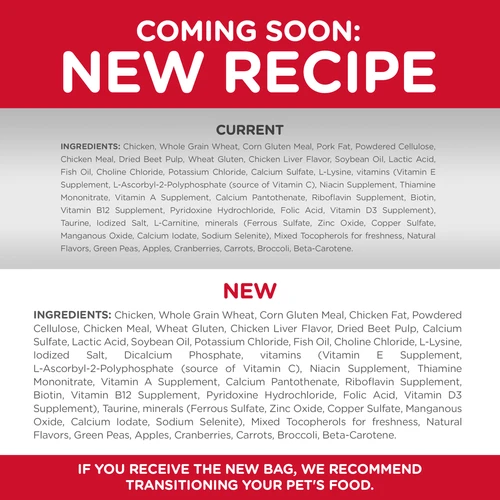 INGREDIENTS: Chicken, Whole Grain Wheat, Corn Gluten Meal, Chicken Fat, Powdered Cellulose, Chicken Meal, Wheat Gluten, Chicken Liver Flavor, Dried Beet Pulp, Calcium Sulfate, Lactic Acid, Soybean Oil, Potassium Chloride, Fish Oil, Choline Chloride, L-Lysine, Iodized Salt, Dicalcium Phosphate, vitamins (Vitamin E Supplement, L-Ascorbyl-2-Polyphosphate (source of Vitamin C), Niacin Supplement, Thiamine Mononitrate, Vitamin A Supplement, Calcium Pantothenate, Riboflavin Supplement, Biotin, Vitamin B12 Supplement, Pyridoxine Hydrochloride, Folic Acid, Vitamin D3 Supplement), Taurine, minerals (Ferrous Sulfate, Zinc Oxide, Copper Sulfate, Manganous Oxide, Calcium Iodate, Sodium Selenite), Mixed Tocopherols for freshness, Natural Flavors, Green Peas, Apples, Cranberries, Carrots, Broccoli, Beta-Carotene.