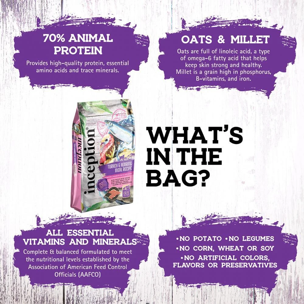 Inception® Turkey & Herring Meal Recipe for cats is formulated to meet the nutritional levels established by the Association of American Feed Control Officials (AAFCO) Cat Food Nutrient Profiles for all life stages.