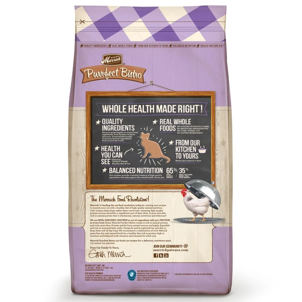 Merrick Purrfect Bistro Grain Free cat foods are recipes for a delicious, nutritious meal. Every Merrick Purrfect Bistro recipe is rich in animal protein and 100% grain free. We recommend a combination of 100% Merrick grain-free dry and cat foods for a healthy diet rich in protein, high in moisture and balanced with vitamins and minerals for adult cats.