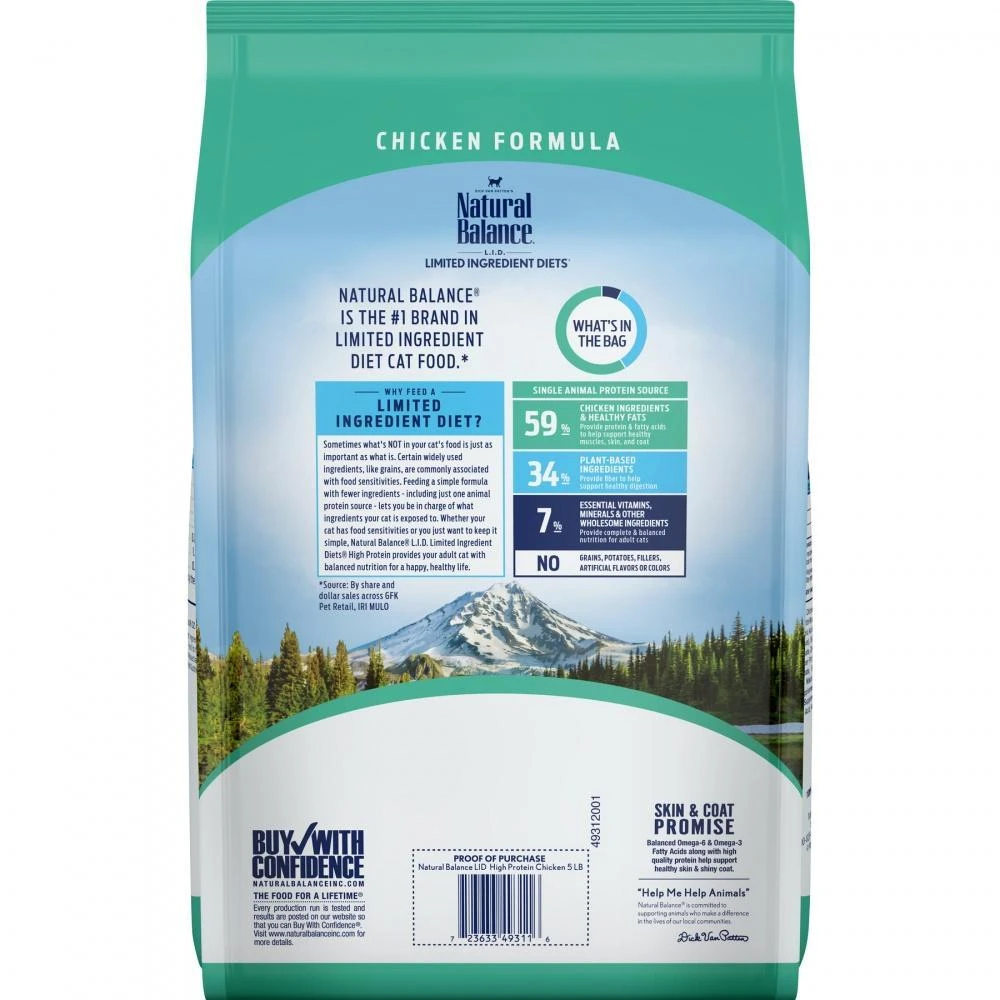 Natural Balance L.I.D. Limited Ingredient Diets dry cat food offers complete and balanced nutrition for adult cats. This simple formula is made with one animal protein source and two primary carbohydrate sources, which provide fiber and essential vitamins and minerals to help support healthy digestion. Chicken is the number-one ingredient of this high-quality food; there are no grains, fillers, artificial flavors or colors. Whether your cat has food sensitivities, or you just want to keep it simple, Natural Balance L.I.D. Limited Ingredient Diets High Protein provides your cat with balanced nutrition for a happy healthy life.