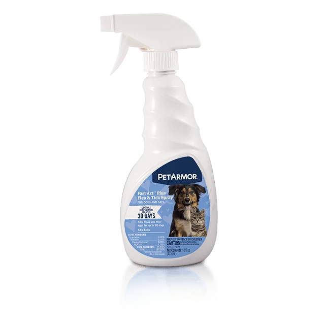 PetArmor Fastact Plus Flea and Tick Spray for Dogs and Cats kills fleas, ticks and flea eggs. Help control reinfestation for up to 30 days with this spray and leave your dog safe from pests! This water-based formula is available in an easy-to-use trigger spray bottle.