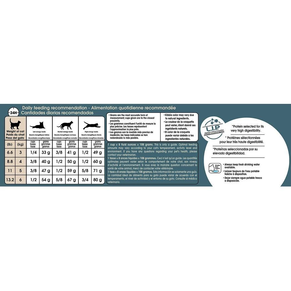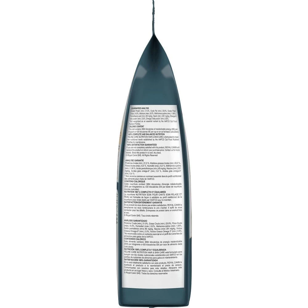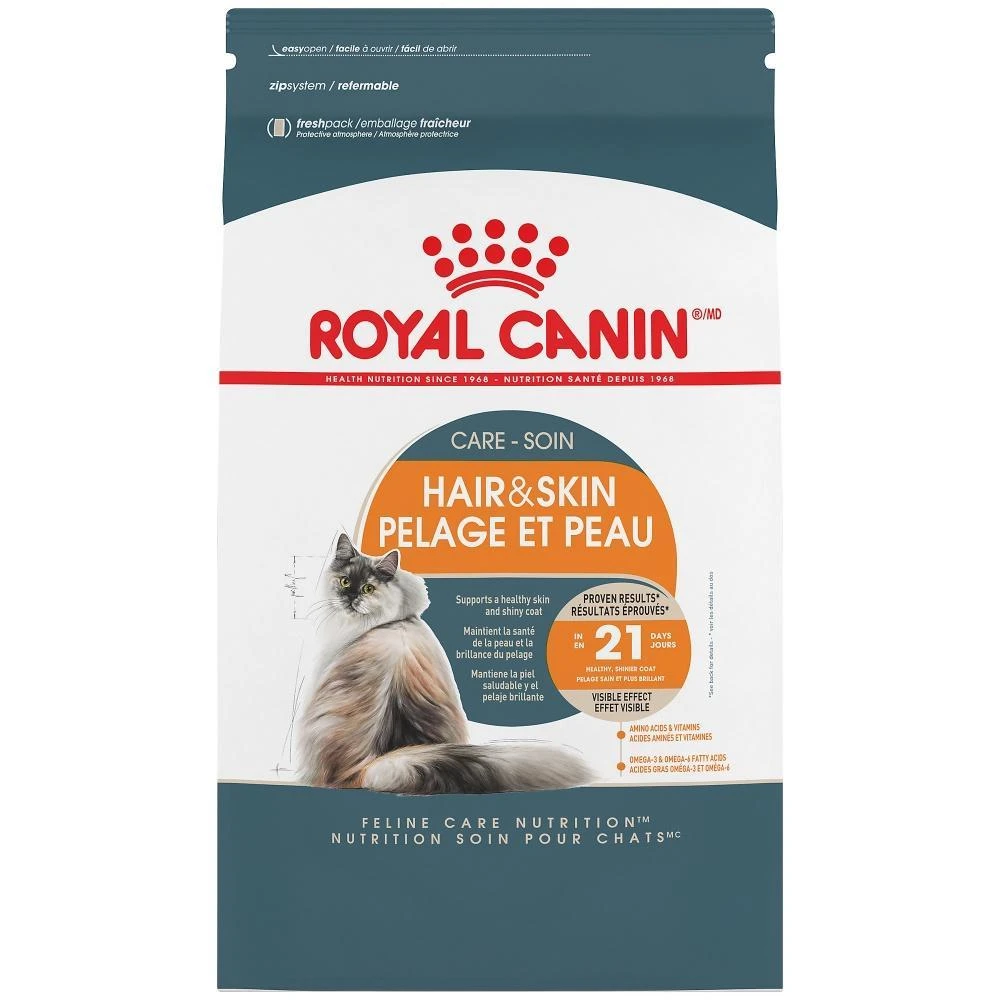 Royal Canin Hair & Skin dry cat food is made to support cats’ sensitive skin and coat issues. This targeted and effective diet can significantly improve coat shine after 21 days of exclusive feeding.* The precisely balanced complex of nutrients, including B-vitamins, nourishes the skin to reinforce its role as a protective barrier. Omega-3 and omega-6 fatty acids work together to promote skin health and maintain a shiny coat condition. And high-quality proteins used for their specific amino acids promote healthy hair growth while helping to prevent common issues like dandruff and dull coats. Try pairing with Royal Canin Intense Beauty wet cat food formulas for a meal your cat will love.