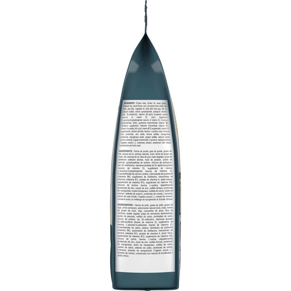 Chicken meal, chicken fat, wheat gluten, brewers rice, natural flavors, corn, corn gluten meal, wheat, rice hulls, pea fiber, vegetable oil, dried plain beet pulp, fish oil, calcium sulfate, sodium pyrophosphate, potassium chloride, salt, DL-methionine, vitamins [DL-alpha tocopherol acetate (source of vitamin E), niacin supplement, L-ascorbyl-2-polyphosphate (source of vitamin C), D-calcium pantothenate, biotin, pyridoxine hydrochloride (vitamin B6), riboflavin supplement, thiamine mononitrate (vitamin B1), vitamin A acetate, folic acid, vitamin B12 supplement, vitamin D3 supplement], choline chloride, taurine, L-cystine, trace minerals [zinc proteinate, zinc oxide, ferrous sulfate, manganese proteinate, manganous oxide, copper sulfate, calcium iodate, sodium selenite, copper proteinate], L-tyrosine, marigold extract (Tagetes erecta L.), rosemary extract, preserved with mixed tocopherols and citric acid.