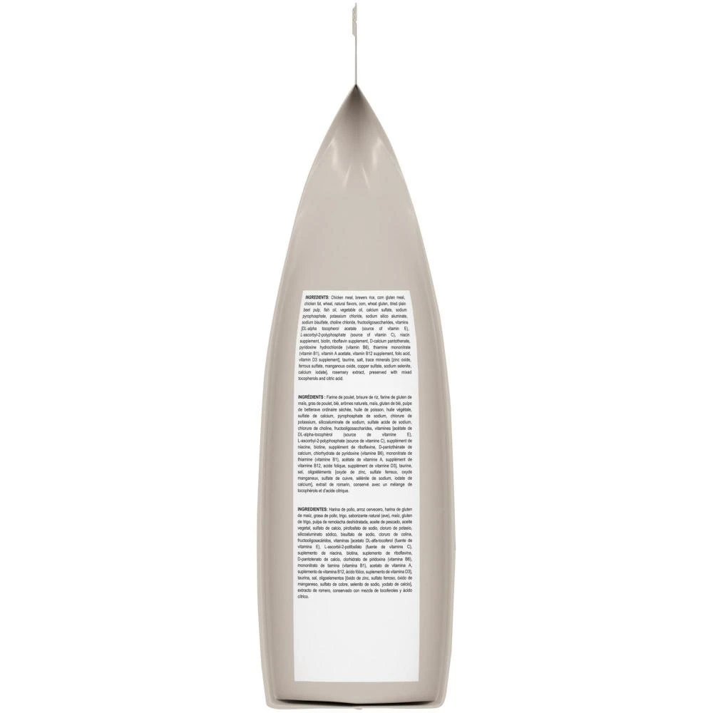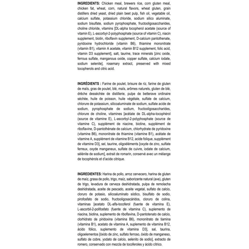 chicken meal, brewers rice, corn gluten meal, chicken fat, wheat, natural flavors, corn, wheat gluten, dried plain beet pulp, fish oil, vegetable oil, calcium sulfate, sodium pyrophosphate, potassium chloride, sodium silico aluminate, sodium bisulfate, choline chloride, fructooligosaccharides, vitamins [DL-alpha tocopherol acetate (source of vitamin E), L-ascorbyl-2-polyphosphate (source of vitamin C), niacin supplement, biotin, riboflavin supplement, D-calcium pantothenate, pyridoxine hydrochloride (vitamin B6), thiamine mononitrate (vitamin B1), vitamin A acetate, vitamin B12 supplement, folic acid, vitamin D3 supplement], taurine, salt, trace minerals [zinc oxide, ferrous sulfate, manganous oxide, copper sulfate, sodium selenite, calcium iodate], rosemary extract, preserved with mixed tocopherols and citric acid.