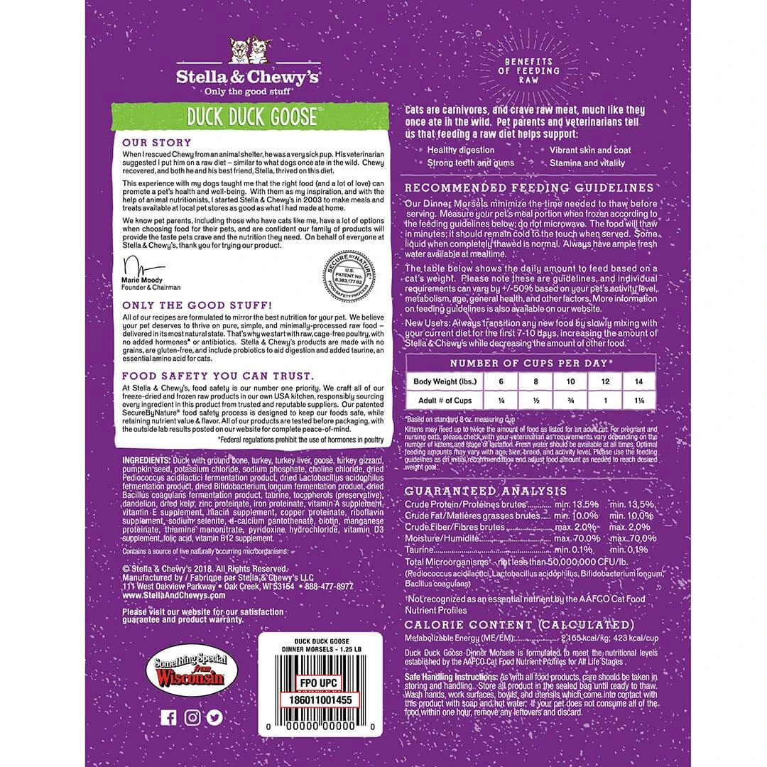 These Stella & Chewy’s Cat Freeze-dried morsels (Duck Duck Goose offering) deliver the most convenient way to feed your cat a raw diet. The most pure, pristine, grain free and economical raw nutrition available! Give your cat what they naturally crave with Stella & Chewyโs freeze-dried raw morsels.