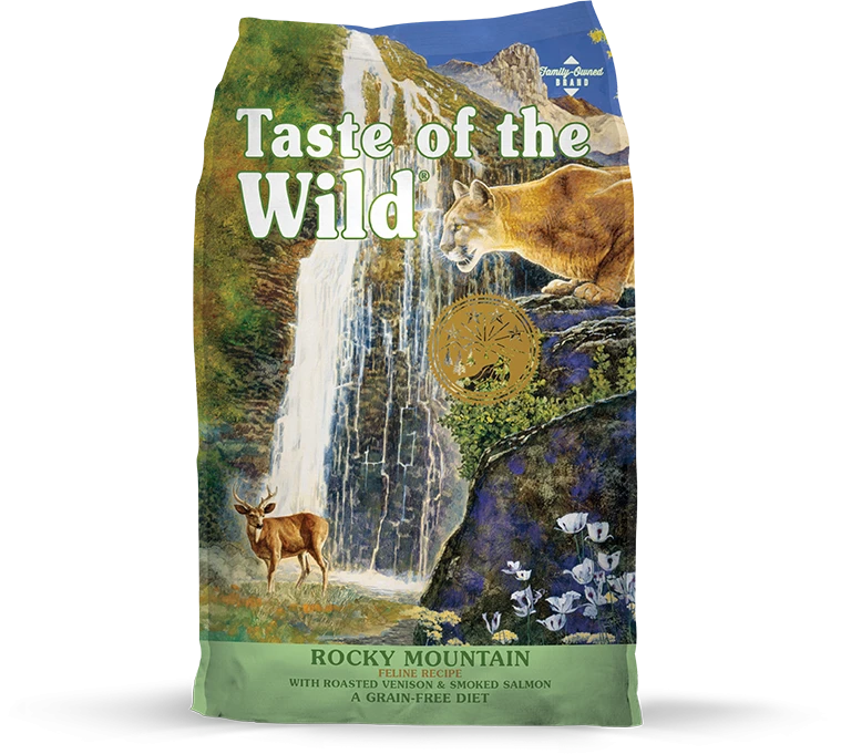 Taste of the Wild Rocky Mountain dry cat food provides a delicious blend of chicken, trout, and venison coupled with nutritious grain free carbs like sweet potatoes, peas, carrots, and blueberries. With chicken as the first ingredient, this diet is designed to mimic an ancestral diet free of grains yet packed with real meat as nature intended. Your cat will find all the nutrition their bodies are geared for in Taste of the Wild Rocky Mountain dry cat food, all while staying away from the nasty fillers like corn, soy or meat by-products.
