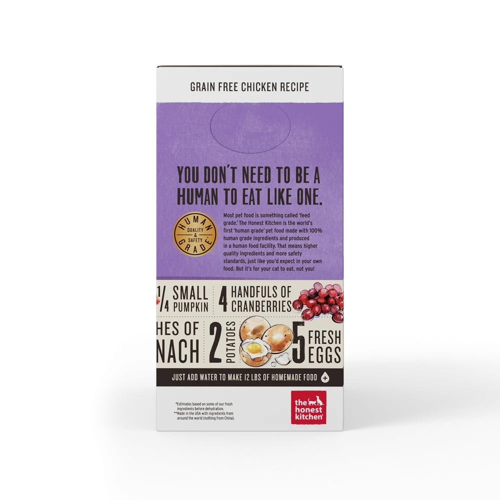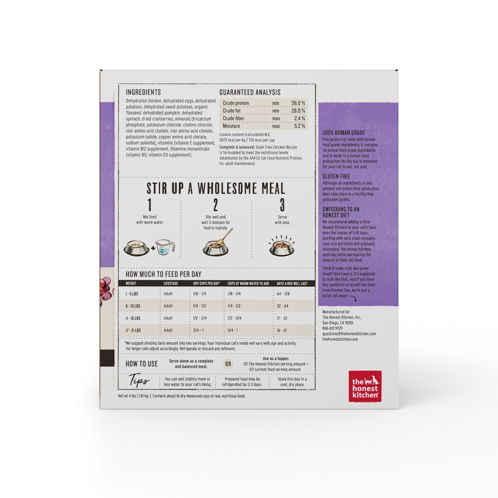Dehydrated chicken, dehydrated eggs, dehydrated potatoes, dehydrated sweet potatoes, organic flaxseed, dehydrated pumpkin, dehydrated spinach, dried cranberries, minerals [tricalcium phosphate, potassium chloride, choline chloride, zinc amino acid chelate, iron amino acid chelate, potassium iodide, copper amino acid chelate, sodium selenite], taurine, vitamins [vitamin E supplement, vitamin B12 supplement, thiamine mononitrate (vitamin B1), D- calcium pantothenate (vitamin B5), riboflavin (vitamin B2), vitamin D3 supplement].