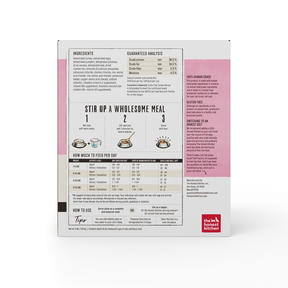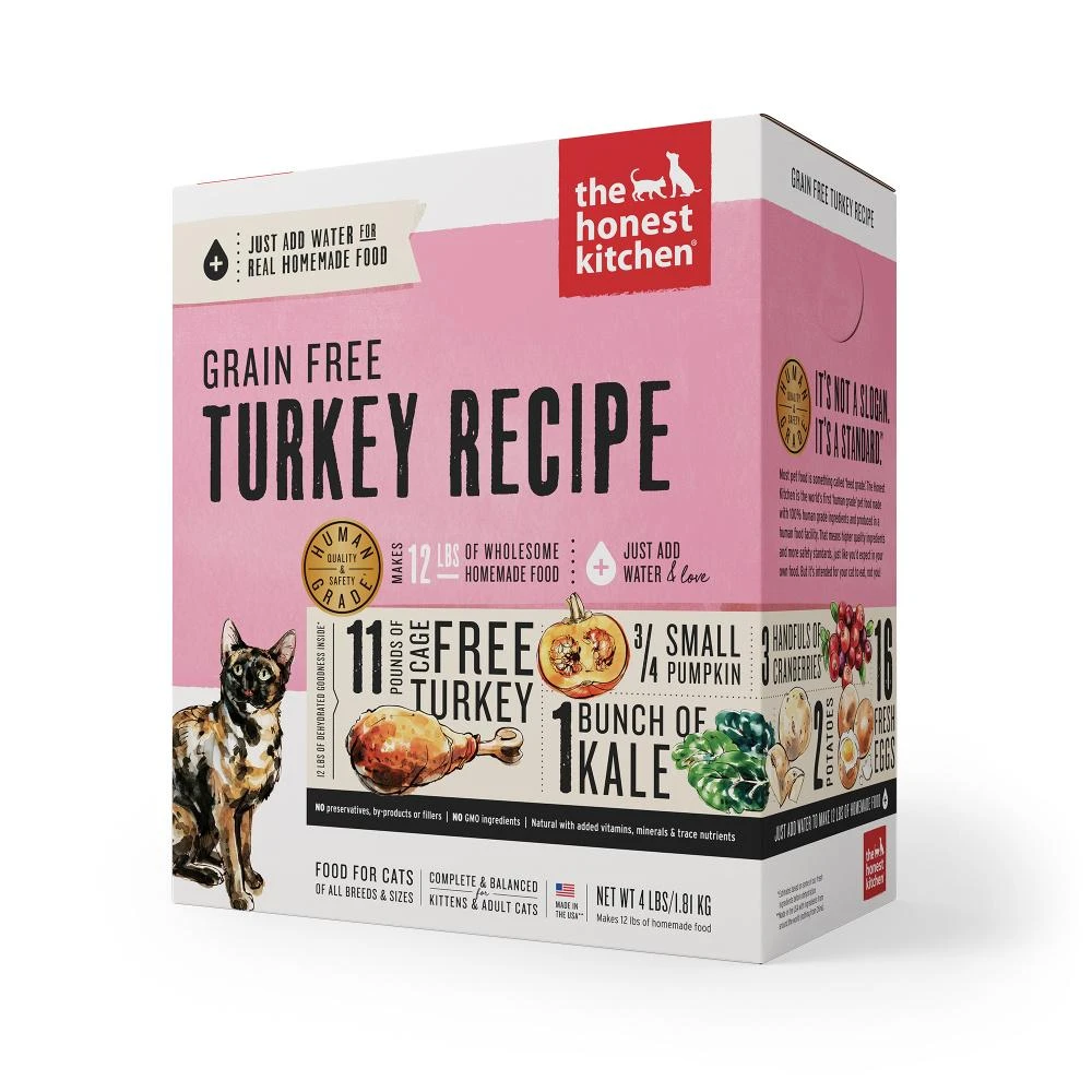 Weāre not only 100% honest about our human-grade ingredients, weāre also proud of them. Made with 70% cage-free turkey, this grain-free, high moisture, healthy cat food is a less processed, whole food alternative to ever-mysterious canned food. The high calorie and low carb content of this complete and balanced dish makes it perfect for growing kittens and active adults alike.