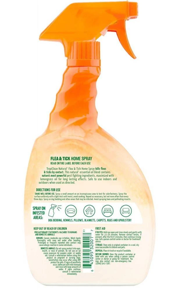 TropiClean Natural* Flea & Tick Home Spray is guaranteed to kill fleas and ticks by contact and can be sprayed directly on carpet, furniture, and bedding to prevent pests indoors. This natural essential oil blend contains some of nature’s most powerful pest-fighting ingredients, maximized with lemongrass oil for long-lasting repellent effects. When used as directed, Home Spray is suitable to use around dogs and cats. Use with other Natural* Flea & Tick products including Max Strength Shampoo and Dog & Bedding Spray for additional pest protection. *Made with natural active ingredients