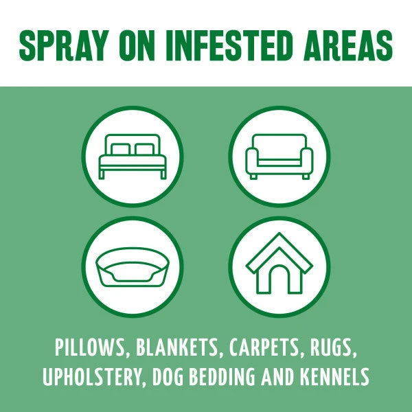 SHAKE WELL BEFORE USE. Spray a small amount on an inconspicuous area to test for colorfastness. Spray the surface uniformly with a light mist until moist, avoid soaking. Repeat as necessary, but not more often than every three days. Spray on dog bedding and other areas that may be infested. Avoid spraying bees and pollinating insects.