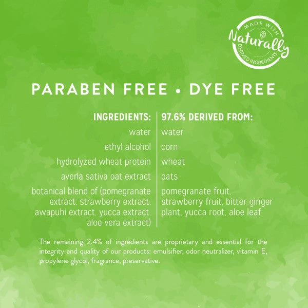 Water, Ethyl Alcohol, Hydrolyzed Wheat Protein, Avena Sativa Oat Extract, Botanical Blend Of (Pomegranate Extract, Strawberry Extract, Awapuhi Extract, Yucca Extract, Aloe Vera Extract) Emulsifier, Odor Neutralizer, Vitamin E, Propylene Glycol, Fragrance, Preservative