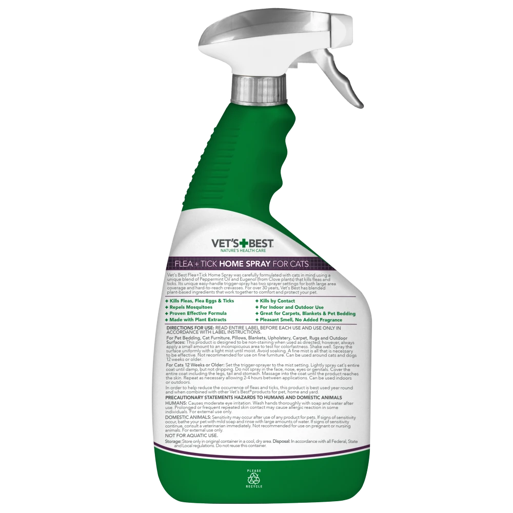 VET’S BEST FLEA AND TICK HOME SPRAY FOR CATS kills fleas, flea eggs, and ticks by contact. Our formula also repels mosquitos!