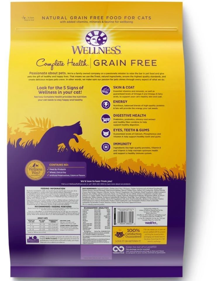 Wellness Complete Health Grain Free recipes feature natural ingredients plus super nutrients for adult cats. These delicious recipes are formulated with a balanced blend of proteins, grain free carbs and select fats, providing the energy your cat needs to thrive.