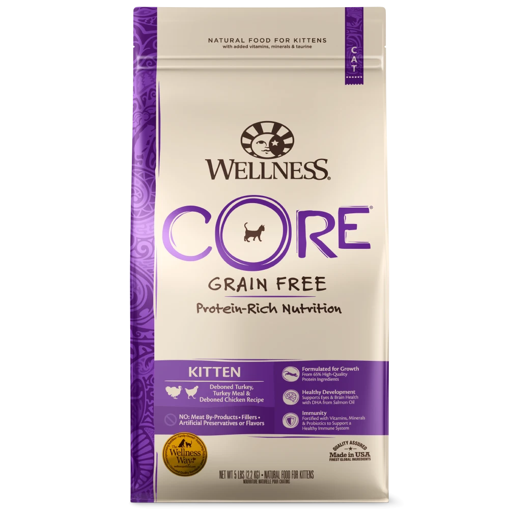 Wellness CORE Grain Free Natural Kitten Health Turkey and Chicken Recipe Dry Cat Food is perfect for growing kittens who love the taste of air and sea. This poultry-packed turkey, whitefish, and chicken recipe is made with delicious deboned turkey, whitefish meal, deboned chicken, herring meal and chicken meal. This recipe will surely have your kitten excited for meal time. Not only is this protein-rich recipe great for keeping them full and satisfied but it also has natural omegas from the ocean to help moisturize skin and prolong healthy coat growth. Wellness CORE Grain-free Kitten Dry Cat Food is a natural source of DHA, supports higher energy, and never includes fillers or grains.