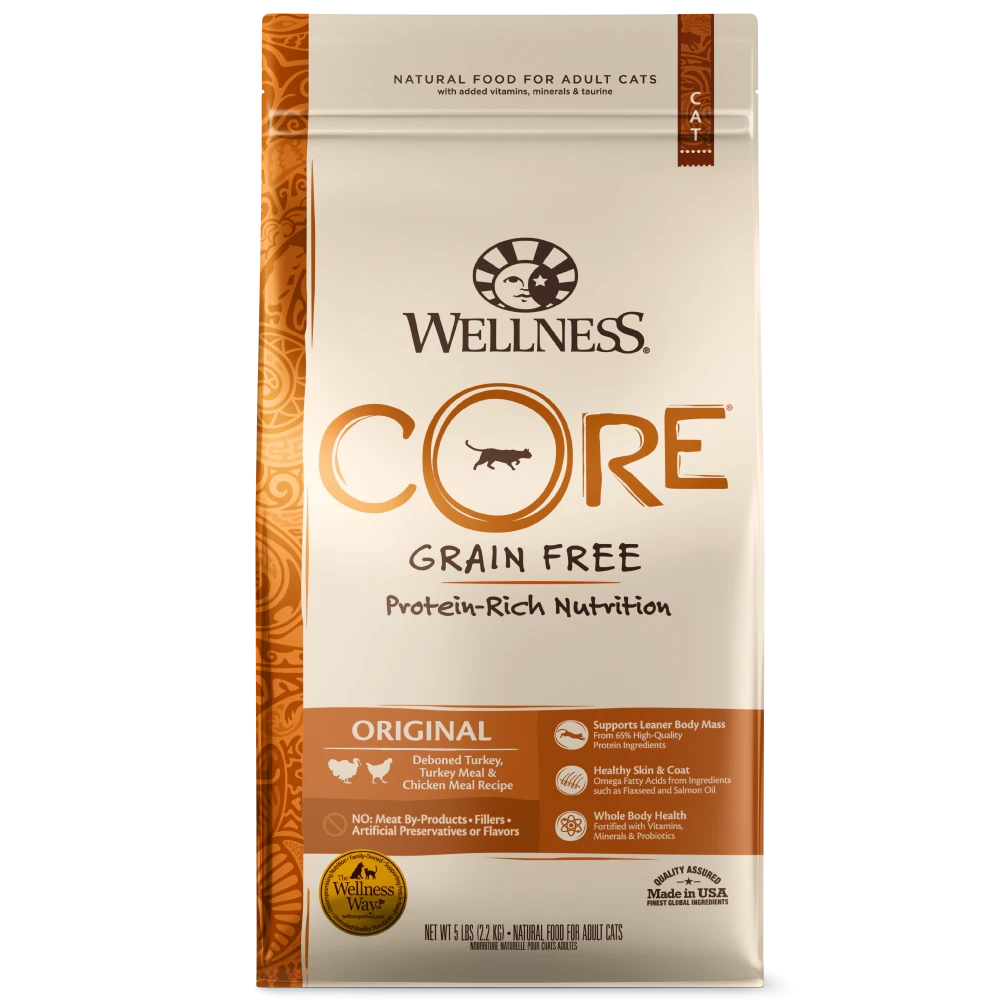Want a cat food that your cat not only craves, but is great for their overall health too? Look no further because Wellness Core Natural Grain-free Original Turkey, Chicken, Whitefish and Herring Recipe Dry Cat Food is the perfect recipe for you and your cat. This dry grain-free recipe has all of the protein needed to keep your adult cat active, and in their best physical shape. Antioxidants, Omega fatty acids through seafood, and probiotics are included to keep your cat’s immune system in check, to ensure a great healthy life!